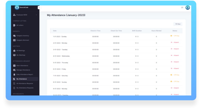 Our Attendance Management System can be used to capture the check-in and check-out entries of every employee. The system will mark the attendance exit/entry. It will automatically update the attendance status in the web portal for every check-in and check-out. Admin can also choose to calculate the total work hours based on the number of check-in and check-out, based on the mode of evaluation selected.